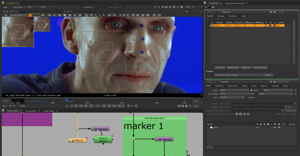 Afterwards i went about attempting to track portions of the guy running’s body in an attempt to make rotoing slightly easier as opposed to moving the roto every 5 or so frames but this ended up not working in the end and ended up scrapping the tracks.
