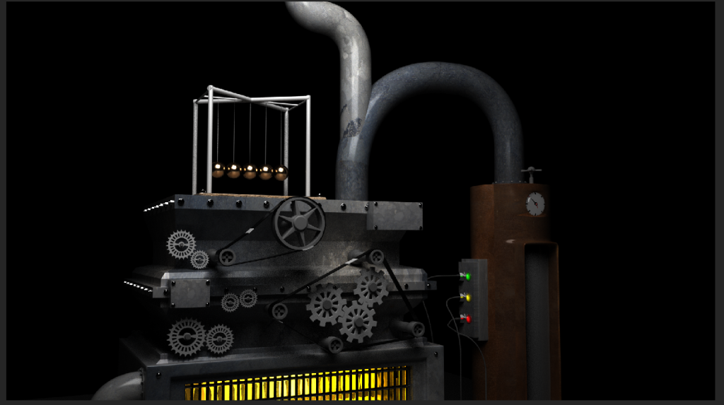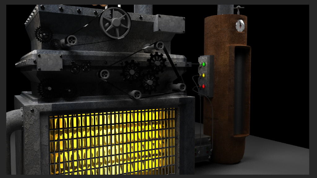 I’m not entirely happy with this machine. I feel like given more time i could have gotten a better comp, better colours and less errors when exporting, as it stands it is missing emissions and has issues with opacity. Unfortunately due to sickness, and problems with group members, i had to focus a lot more time on the collaborative group project than working on this machine and i do wish i had more time to refine it and polish it off, as i feel with just a bit more tweaking i could get it looking much more realistic in the scene.