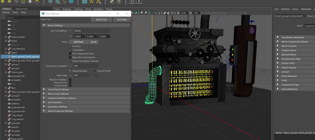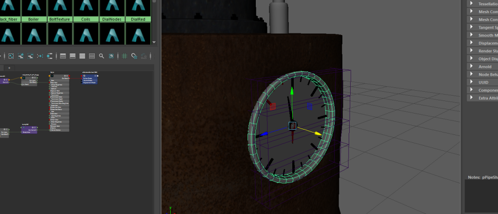 With the machine only facing one way, i decided on the pipes to just rotate them facing away as the seam wouldn’t be seen. With ReUving the pipes i would need to take off the deformers, take the bolts out of the shell by only using face selection, then re-uving the pipes as cylindrical and reapplying everything, and applying a different texture to the bolts.