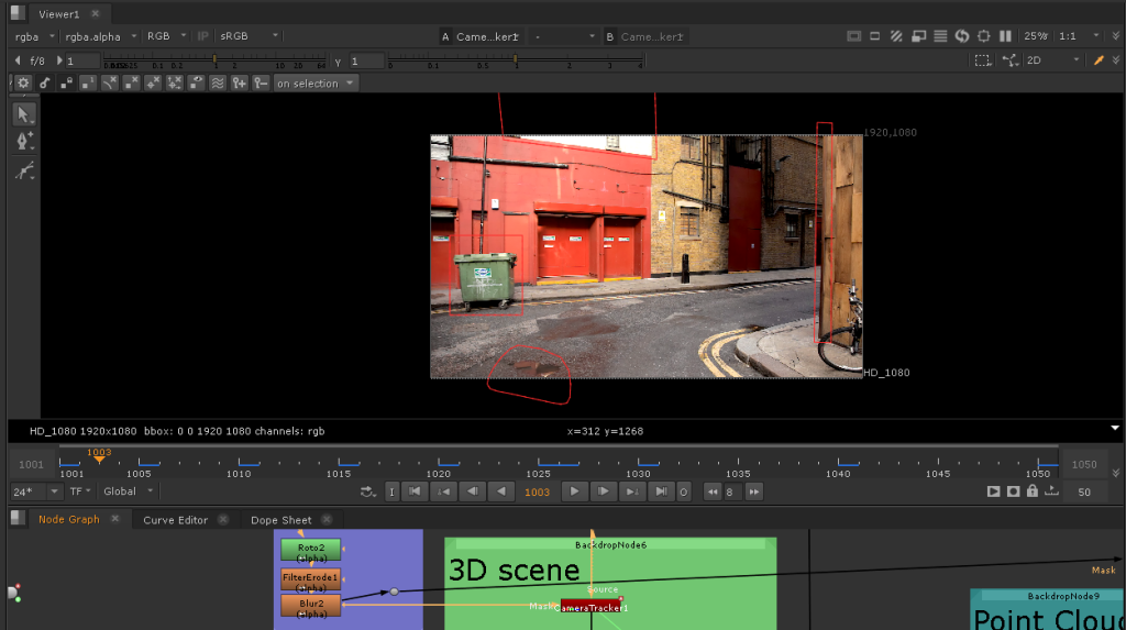 We then used the Camera Tracker node to get a proper track and create point clouds for our 3D Scene.