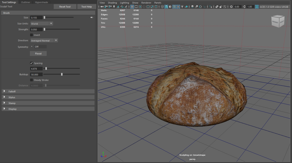 In the middle of the bread there’s meant to be a divet and while there is a bit of one due to the bump and displacement, this needed to be way more. I used both a combination of the lift surface and grab mesh sculpting tools and pulled around the triangular portions of the texture to raise the crusts of the bread and give some small dips and raised edges to make it a more organic shape.