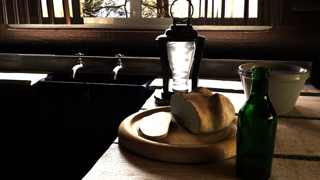 I tweaked it a bit afterwards as now there was too much atmosphere and it simply looked cloudy, but while rendering this i noticed an issue, the bread i built being very smooth for no particular reason. I noticed that somewhere along the way, the bread’s displacement map had just failed to load in properly at all. I took this opportunity to fix this and also to add a slight bump map to the bread’s plate, and to add some roughness to the plate’s specularity as it was a bit too shiny.